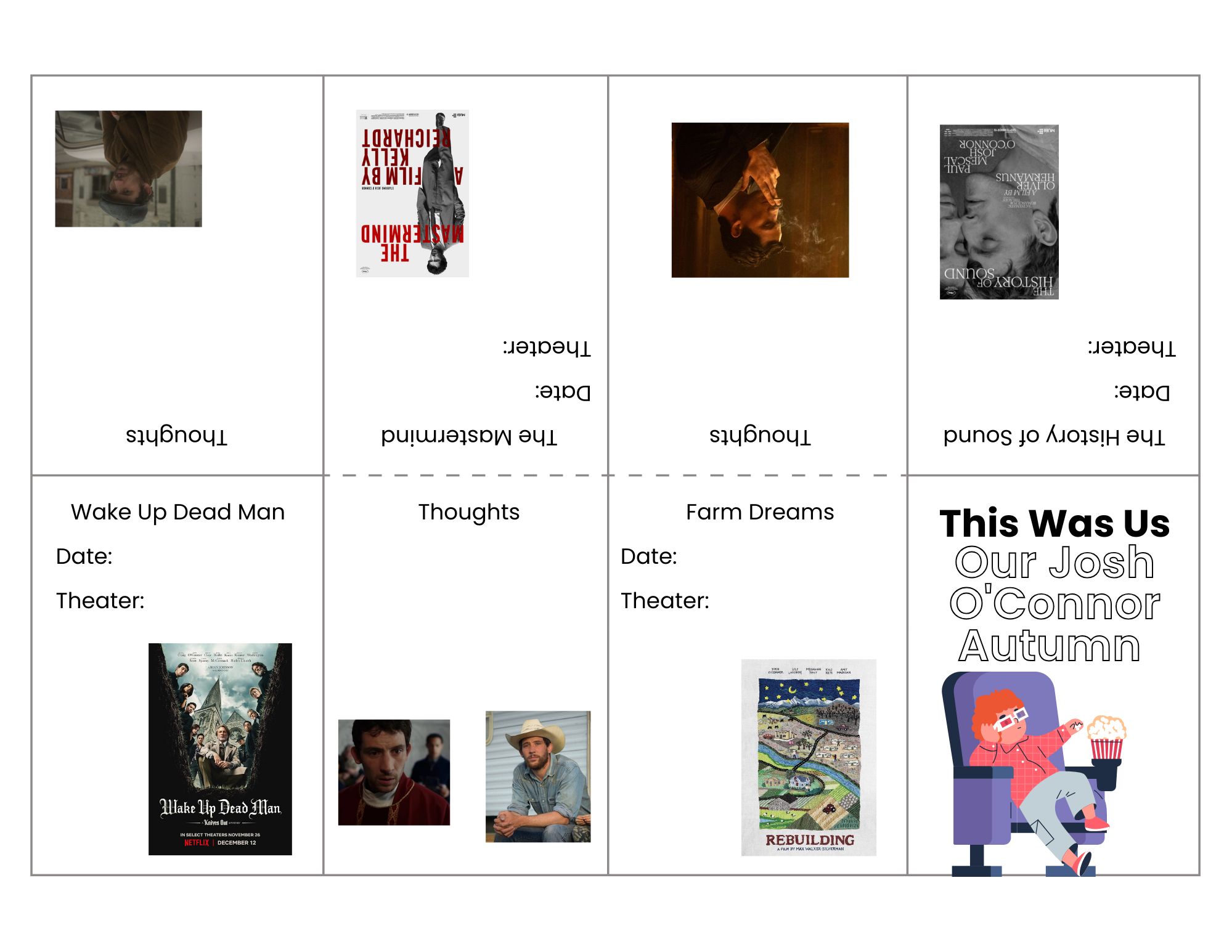 Josh O’Connor had four cinema releases in the fall of 2025 and I went to see every one in cinema. Unfortunately, the final film was not playing in any theater in my city. This did not stop me. I did have to take a ferry and journey onwards to see Farm Dreams (err Rebuilding), but it was worth it. Hilariously, aside from me and my friend, there were four other people at my screening and at least two of them had made the same out-of-town journey as we did for the exact same purpose of completing the Josh O’Connor Fall 2025 Cinema Quartet. I made a zine to commemorate. If you also completed the quartet, please feel free to save, print, and fold your own.